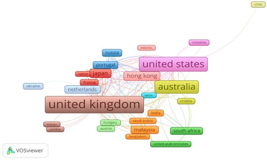 Figure 4 shows a visualization display generated through VOSviewer that highlights the country or territory distribution by area. The closer the distance, the stronger the connection between the countries, suggesting that these countries have strong intra-country collaboration. Figure 3 shows co-authorship by 87 countries categorized within 23 clusters (color coded), with a total of 241 links and a total link strength of 378. The United Kingdom is the most productive country, with the largest association plus 160 co-authorships connected to 15 countries or territories. This is followed by the United States (36 links), Australia (24 links), China (15 links), Canada (11 links), and others. There are about ten countries that do not have any connection in international publications. However, researchers from Chile and Argentina are associated with only one country. The advantages of international collaborative collaboration are not only related to networking, exchanging knowledge, access to different expertise, and assimilating a different culture, they can help raise international awareness that benefits the universities and research. In addition, outputs of the United States of America and other key countries are deliberately included to compare with United Kingdom’s outputs on higher education internationalization.