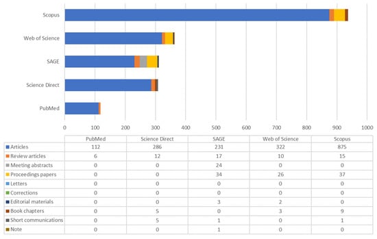 The initial literature search conducted on 1 April 2022 was based on a current search for the terms “Urban areas” and “VOCs” in titles, abstracts, and keywords in five academic databases: Web of Science, Scopus, Science Direct, PubMed, and SAGE. The data range was set to “published all years to the present”. The document type was set to “scientific articles and review articles”, and the language was set to “English”. The results are presented in Figure 1. Of the five databases used, Scopus recorded the highest number of publications of a specific type related to the occurrence of VOCs in urban areas, with 875 articles. Ultimately, records from the Scopus database were selected to continue the review.