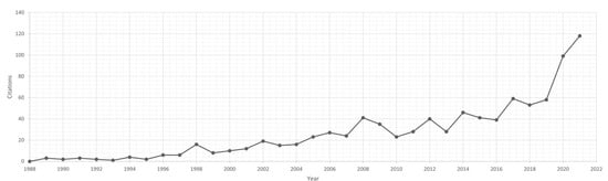 The temporal distribution of the collected bibliographic records on VOCs in urban areas was examined. The earliest related work was published in 1989. The number of publications published each year is shown in Figure 2.