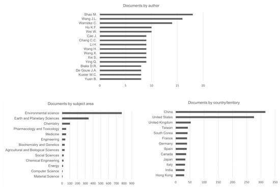 Among the articles on volatile organic carbons in urban areas, the number of articles published in 2020–2021 was much higher than in previous years, reaching 118 in 2020. The bibliographic analysis showed that more and more attention is being paid to this topic. Figure 4 provides a summary of documents by author, subject area, and country/region.