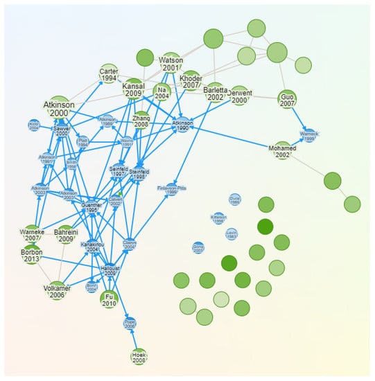 A citation network graph contains green nodes representing the most cited papers using the phrases “urban areas” and “VOCs” in the Scopus database, and blue nodes representing what in this case are citations of Atkinson [44]. Each line connecting the nodes represents a citation relationship between the papers. As of the nodes themselves, intensity of the colours is based on recency, and the size of the blue nodes is based on the number of connections they have with the green ones. Since some of the green nodes are not citations of that publication, there are no connections between them.