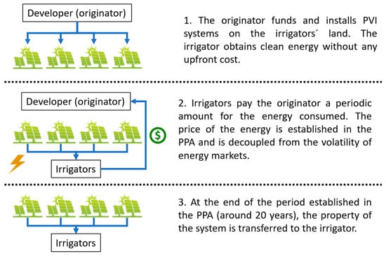 In order to overcome the aforementioned barrier, tailored financial instruments (FI) and business models with the capacity to attract affordable capital to PVI projects are needed. In this regard, business models based on power purchase agreements (PPA) have proven their capacity to facilitate investments in clean technologies in many contexts [5]. PPAs provide long-term guarantees for investors and consumers of clean energy, a prerequisite to making projects investable and facilitating access to affordable finance. A PPA consists of a bilateral agreement between an energy consumer (such as an irrigator) and a specialized provider of clean energy, such as an energy services company (ESCO, see Figure 1). A PPA typically establishes the price of the energy for the consumer, the amount of energy to be delivered to the consumer, and the term of the agreement between the parties. Once these details are agreed upon, the provider executes the required investment and carries out the necessary activities to operate and maintain the systems in optimal conditions. Then, the consumer pays a periodic bill for the energy and receives a guarantee of service from the provider during the life of the PPA. For the PPA model to be viable, it is required that competitive energy prices can be offered to consumers, equal to or lower than the price of incumbent alternatives. In this regard, the capacity of the PPA provider to offer such competitive prices to potential consumers depends on accessing long-term affordable funds to pay for the necessary upfront investments.