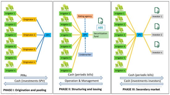 Securitization involves different stages and tasks including bundling a sufficient number of assets into a dedicated pool, assessing its value, creating securities based on the pool, and selling and servicing the related bond issuance, as presented in Figure 2. Securitization allows for transforming illiquid assets (PPAs) into liquid ones (green bonds), increasing the attractiveness for investors and facilitating the issuer’s access to capital markets, a key factor in obtaining affordable finance [7]. Nevertheless, securitization is also expensive as it requires the involvement of specialized services and financial intermediaries to bundle the assets used as collateral and to produce and monetize the resulting securities. Furthermore, securitization fixed costs are high (around EUR 2 M per issuance) meaning that it is only suited to large pools of assets so the stranded costs can be sufficiently diluted. As a result, the use of securitization as a financial tool to fund the decarbonization of irrigated agriculture can be hampered by its costs and the distributed nature of the PVI systems.