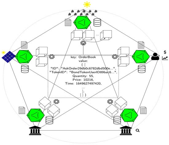 The application includes a secondary market for the tokenized bonds, which is operated by the same network used to carry out the securitization. Thus, an investor client can submit an ask order proposal into the system in order to sell his/her bonds (dotted square). Such a proposal is then verified by a majority of the peers (three of the five green hexagons in Figure 3). Once verified, the proposal is sent to the ordering service. Next, the lead orderer will package this transaction into a block, deliver it to the rest of the orderers, add this new block to the BC and deliver this data to peers who will update their own copy of the ledger.