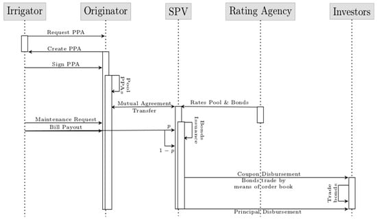 Sequence diagram of the decentralized securitization process of a PVI-PPA. Gray boxes represent organizations acting as objects interacting among themselves to execute the transaction. The direction of the arrows reflects to which organizations the function is applied at each stage. Thus, the originator proposes a PVI-PPA to an irrigator client which is then transferred to an SPV. Eventually, the SPV sells bonds to investors at issuance, and investors trade bonds among themselves in the secondary market. Vertical-oriented boxes represent the time during which data are available on the ledger, e.g., PPA is created before pool or bonds.