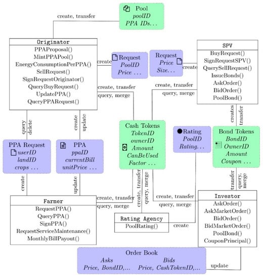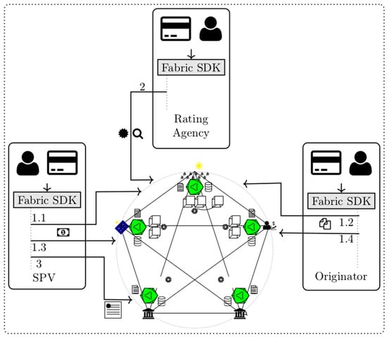 The second business scenario deals with asset bundling into a pool, structuring the securitization, and issuing securities (see Figure 7). Here, the aforementioned beforeTransaction verifications ensure that only the originator, the SPV, and the rating agency clients interact within this scenario. As in a centralized securitization, the originator sells the PPA to an SPV in order to recover the investment. Once the SPV pays the originator for the PPA-PVI, tokenized cash flows produced from the PPA are relocated to the new owner (steps 1.1, 1.2, 1.3, and 1.4). This process begins with a function that includes the price that the SPV is willing to pay and the size that the pool must achieve to initiate the securitization. The originator queries this request from the SPV and submits another request with the price at which he/she is willing to sell and the pool ID. This latter request will also be queried by the SPV and will “sign” (again, the sign means changing a boolean attribute) a request which includes both. This request is verified in order to not allow already signed ones to sign again and to ensure that the cash token provided has enough funds to overcome this transaction and is not locked. Now, the originator queries this last request and “signs” it, thus verifying that the pool size and the cash token amounts match each other. This mutual transference is achieved by means of a Delivery v. Payment process and can be initiated by any party. This process either results in both assets (the PPA and the cash tokens) swapping ownership or in the ownership remaining unchanged. At a certain time, the pool will be large enough for the securitization to take place. In order to produce high-quality securities, a rating agency will assess the pool of PPAs (step 2) by observing the recorded information in the BC and the quality of the implementation. By taking into account the results of this independent assessment, the SPV client will decide if the securitization is viable. If the SPV decides to go ahead, a bond issuance under the UTXO model (step 3) will be carried out, which will be offered to investors in a primary market. At issuance, SPV establishes the characteristics of the bond, including the assets backing it and the parameters to calculate the coupon and principal payments, as well as their equivalence in cash tokens.