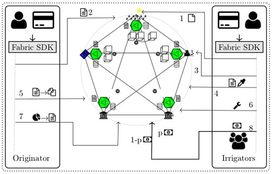 In order to simplify the model, we have considered that all the cash has already been tokenized on-chain (following the UTXO model) at the beginning. In a real scenario, cash should be tokenized at the time when any transaction involving payments in normal currency takes place; for example, each time the irrigator has to pay a bill, an exchange mechanism should be included. Users wishing to interact in the network must be registered by their organization’s CA and this membership will provide access control. Moreover, it is expected that organizations with few users (originator, rating agency, SPV) will not use the web application.