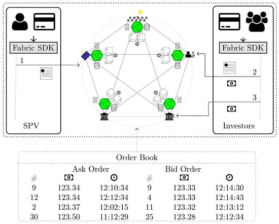 The last business scenario deals with the secondary market, which is represented in Figure 8. In this scenario, the so-called beforeTransaction verifications will allow only the SPV and investor clients to participate. In this regard, the SPV will also act as the underwriter of the issuance, selling the securities directly to investors. For this purpose, the SPV will submit sell requests (ask orders) at the issuance price that will be included in an order book state (step 1). Every investor will be able to query the order book to check the price as well as the underlying pool of PPAs to assess the quality of the collateral. The order book included in this model works as an order-driven market, where matching is achieved at the same time a bid or ask order is submitted. Investors in the bond tokens can also query the value of the cash tokens available in the SPV to pay the principal at any time, so they could make an accurate assessment of the value of the securities, for example by determining whether they are under or over collateralized. The decentralized market mechanism included in the transaction can perform the essential functions of a centralized market with the advantage that no intermediaries are needed. For example, if at first instance matching is not achieved, the order’s underlying assets will be labeled as . Thus, the application ensures that a unique ID cannot introduce several orders at the same time with the aim of executing only the most advantageous (step 2). Additionally, whenever a bond is not labeled as CanBeUsed: False, its owner will receive cash tokens on the coupon date (step 3). This is guaranteed because several verifications are carried out: the amount, the ownership, and match checking.