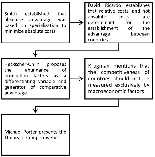 The concept of competitiveness has evolved throughout the history of economic thought, adopting different approaches, from mercantilist theories, which introduced the idea of a rivalry between nations, to Porter’s well-known theory of the competitive advantage of nations [5]. Precisely, Smith established that absolute advantage was based on specialization to minimize absolute costs (profit maximization); this became the way for a country to obtain greater profits and trade was the generator of growth in world production. Subsequently, David Ricardo advanced in the theory defined by Smith, establishing that relative costs, and not absolute costs, are determinants for the establishment of the advantage between countries until the contribution of Heckscher-Ohlin appeared by proposing the abundance of production factors as a differentiating variable and generator of comparative advantage [6].