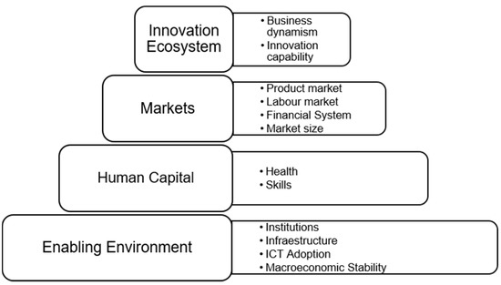 This version is a compilation of 98 indicators or observed variables that capture concepts that matter for productivity and long-term prosperity. These indicators are collected and grouped into 12 pillars or latent variables (Institutions, Infrastructure, ICT adoption, Macroeconomic stability, Health, Skills, Product market, Labor market, Financial system, Market size, Business dynamism, and Innovation capability). These 12 pillars are grouped into four categories or components (Enabling environment, Human capital, Markets, and Innovation ecosystem) [12]. This structure of indicators, pillars, and categories or components is shown in Figure 2.