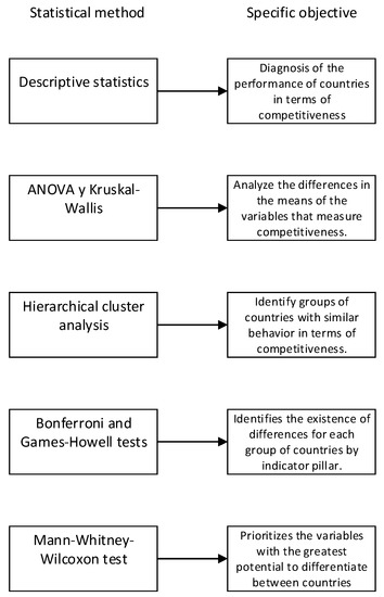 Thus, and as previously commented, this research uses the Global Competitiveness Index data published in 2019 by the World Economic Forum [15]. Specifically, 139 records were selected and utilized corresponding to countries that did not present missing data in any pillar, including most Latin American countries and countries in the Central American region. Although the analysis focuses on the Central American countries (Costa Rica, El Salvador, Guatemala, Honduras, Nicaragua, and Panama), it was necessary to use the complete information of the countries mentioned to have a sufficient sample size to apply the analysis and classification methods to analyze the competitive differences and similarities between countries.