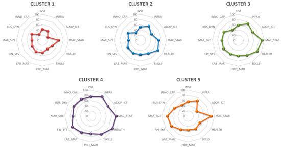 While cluster 3 and cluster 4 present significant differences in the pillars of Macroeconomic Stability and Market Size. In addition, cluster 4 compared to cluster 5 presented significant differences in 4 pillars, Infrastructure, Skills, Labor market, and Business dynamism.