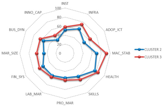This result confirmed the division in competitive terms among the Central American countries. In addition, the same is visually ratified in Figure 5, where a comparison between clusters 2 and 3 is presented.