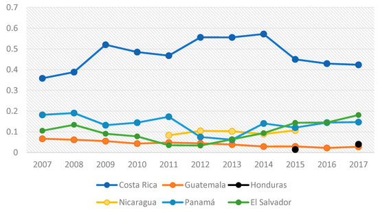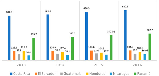 In this sense, the Central American region and the countries that comprise it present notable inequalities in some micro- and macroeconomic indicators related to competitiveness [12]. Although it is worth noting that the countries of the region showed positive changes in their competitiveness during the 1990s [13], in recent years, they have experienced stagnation on average, only surpassed by Panama [12]. In addition, it should be considered the work done regarding the region’s integration, where a process of continuous changes has been experienced concerning trade integration, at the same time on infrastructure and mobility, tourism, environment, and more [14].