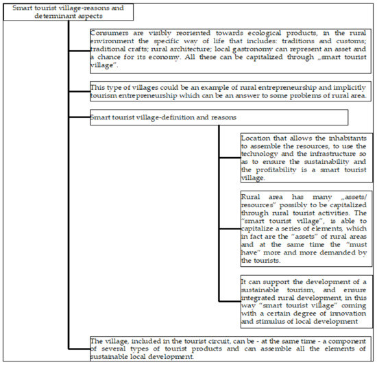 Why must we speak about smart village in tourism? Because in our days tourists want to know the rural traditions, culture, and nature, and they want to spend their vacation in an intact rural environment, with local products and specialties, looking for fresh air, sports, and quiet [15]. Thus, rural entrepreneurs, which bets on the introduction in the tourist product of: existing natural resources; agricultural farms themselves; various tourist attractions defined as “curiosities”; the specific rural way of life that includes: traditions and customs; traditional crafts; rural architecture; local gastronomy [16] has only to gain. Therefore, to the question why “smart tourist village”? one can come up with the answer that it can support the development of sustainable tourism, and through which it can ensure integrated rural development, in this way “smart tourist village” coming with a certain degree of innovation [17] on the part of stimulus of local development [18,19,20]: