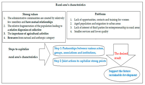 To “survive” in a cost-effective way [25,26] and to be a sustainable one this rural community, represented by various actors, groups, associations, and institutions, must be able to mobilize itself for long-term joint actions and take responsibility for this continuous process of development (see Figure 2) [27,28]. It is obvious that the rural area has many problems, but at the same time many resources/assets, [29] which could represent “its raw material/strong values”, (see Table 1) to support a future sustainable development.