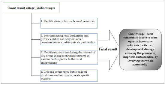 “Smart tourist village” comes with the possibility of supporting the recovery of the rural economy, using for this purpose local resources and a series of distinct stages (see Figure 3). It is a sustainable initiative through the fact that the involvement of the whole community is necessary and the development of tourist activity will bring benefits for the whole community and a higher attention for resources protection [31].