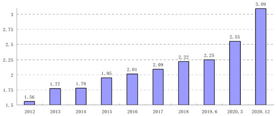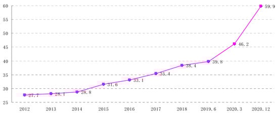 As the country continues to promote the development of rural revitalization strategies, and with the continuous support of national policies, such as Digital Village and Broadband China, China’s rural internet has developed rapidly. According to the “Statistical Report on the Development of the Internet in China” (Figure 1 and Figure 2), the number of rural internet users in 2012 was estimated to be 156 million, and by 2017 this figure exceeded 200 million, reaching 209 million. By December 2020, rural netizens have exceeded 309 million, an increase of 153 million over 2012, and the growth rate has reached nearly 100%. The internet penetration rate in rural areas has also increased from 27.7% in 2012 to 59.9% in December 2020.
