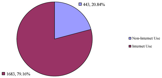 The core explanatory variable of the article is the use of the internet by farmers. In order to measure the use of the internet by farmers, a question was designed in the questionnaire as follows: “Do you use mobile phones, computers and other equipment to obtain information about agricultural production?” If the farmer’s answer is “yes”, we think that he uses the internet. On the contrary, if the answer is “no”, we think that he does not use the internet. Among the farmers surveyed (Figure 4), 1683 people used the internet to obtain agricultural production information, accounting for 79.16%; 443 people did not use the internet to obtain agricultural production information, accounting for 20.84%. The proportion of the survey sample using the internet is higher than the internet penetration rate in Figure 4. The possible reason is that the eastern and central parts of the survey sample are provinces that produce more stalk. Compared with some western provinces, these provinces have relatively better economic and social conditions, and use the internet more frequently.