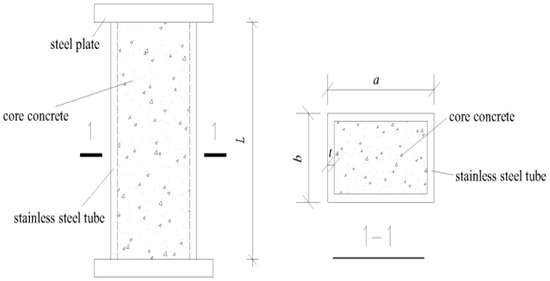 The specimens were designed to mainly consider the influence of section form and steel tube thickness, and a total of 7 specimens were examined [21]. The schematic diagram of a specimen is shown in Figure 1, and the parameters are shown in Table 1. The steel plates are welded with the outer stainless steel tube. The steel tubes of specimens were austenitic 304 seamless stainless steel tubes with thicknesses 4 mm, 5 mm, and 6 mm, and the average yield strength fy was 534.3 MPa, 572.3 MPa, and 598.0 MPa, respectively. The core concrete in specimens was C40, the average cubic compressive strength fcu was 43.96 MPa, and the axial compressive strength fc was 29.48 MPa. The Eurocode 4, Eurocode 3, and Chinese code [25,26,27,28,29,30] were followed.