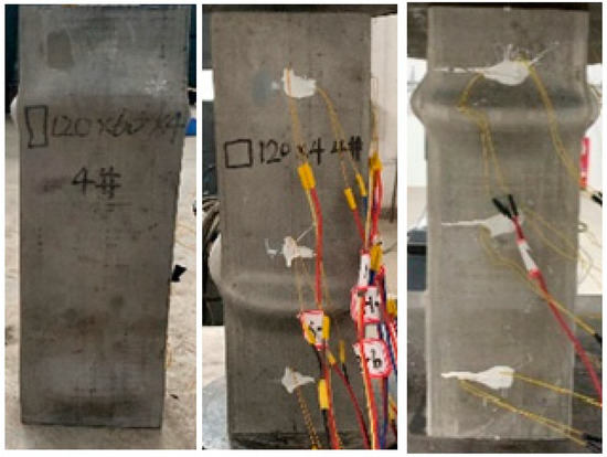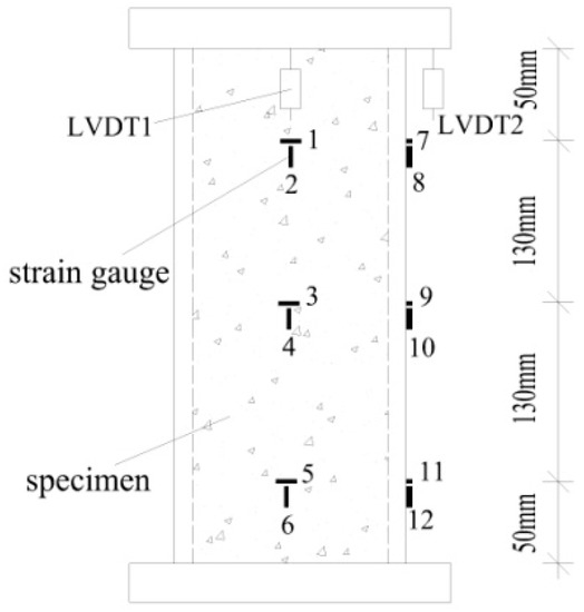 The test used a 300-ton electrohydraulic servo-long-column press machine with a displacement-controlled loading rate of 0.01 mm/s. A total of 2 LVDT displacement meters were arranged on the top of the two adjacent sides of the specimen to measure the axial deformation of the specimen, and 12 strain gauges were arranged on the upper, middle, and lower parts of the two adjacent sides of the specimen to measure the longitudinal and hoop strain of the specimen. The arrangement of strain gauges and LVDT displacement meters is shown in Figure 2. The test was terminated if the load dropped to 75% of the peak load or the axial displacement of the specimen was 5% of the length of the specimen. The Eurocode 4 and Chinese code [25,31] was followed.