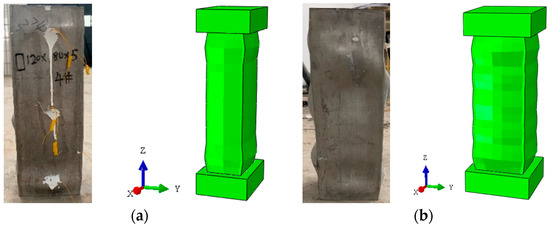 Failure mode comparison between finite element and test. (a) Rectangular specimen S2. (b) Square specimen S7.