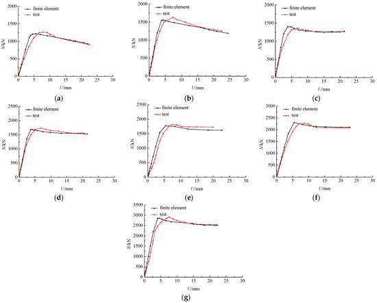 Comparison of load–displacement curves for the finite element model and test. (a) S1. (b) S2. (c) S3. (d) S4. (e) S5. (f) S6. (g) S7.