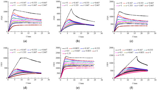 Comparison of load–displacement curves subject to different parameters. (a) 120604C40720. (b) 120604C402880. (c) 120605C40720. (d) 120605C402880. (e) 1201206C40720. (f) 1201206C405760.