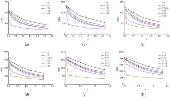 It can be seen from Figure 9c,d that when the width of the stainless steel tube b is 80 mm, the variation of the compression bearing capacity with relative eccentricity under different slenderness ratios is similar to that in Figure 8a,b. When the slenderness ratio is six, the relative eccentricity increases from 0 to 2, and the compression bearing capacity decreases by 54.46% and 54.56%, respectively. When the slenderness ratio is 48, the relative eccentricity increases from 0 to 2, and the compression bearing capacity decreases by 74.25% and 78.15%, respectively. Comparing Figure 8c,d, when the slenderness ratio is six and the relative eccentricity is one, the thickness of the stainless steel tube increases from 4 mm to 5 mm, and the compression bearing capacity increases by 18.18%. When the slenderness ratio is 48 and the relative eccentricity is one, the thickness of the stainless steel tube increases from 4 mm to 5 mm, and the compression bearing capacity increases by 17.44%.