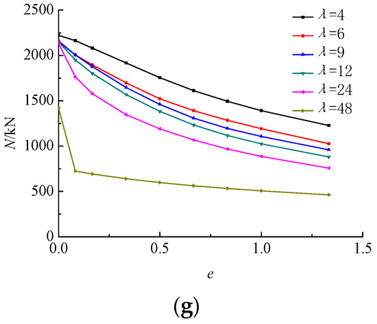 It can be seen from Figure 9e–g that when the width of the stainless steel tube b is 120 mm, the decreasing trend of the compression bearing capacity is reduced; the smaller the slenderness ratio, the smaller the decreasing trend, and the variation is similar to the above. When the slenderness ratio is four, the relative eccentricity increases from 0 to 1.33, and the compression bearing capacity decreases by 47.04%, 44.40%, and 44.78%, respectively. When the slenderness ratio is 48, the relative eccentricity increases from 0 to 1.33, and the compression bearing capacity decreases by 77.06%, 66.90%, and 67.47%, respectively. When the relative eccentricity is 0, the slenderness ratio increases from 4 to 48, and the compression bearing capacity decreases by 11.42%, 36.73%, and 36.08%, respectively. When the relative eccentricity is 1.33, the slenderness ratio increases from 4 to 48, and the compression bearing capacity decreases by 61.64%, 62.33%, and 62.34%, respectively. Comparing Figure 8e–g, when the slenderness ratio is four and the relative eccentricity is one, the thickness of the stainless steel tube increases from 4 mm to 5 mm and then from 5 mm to 6 mm, and the compression bearing capacity increases by 24.61% and 7.41%, respectively. When the slenderness ratio is 48 and the relative eccentricity is one, the thickness of the steel tube increases from 4 mm to 5 mm and then from 5 mm to 6 mm, and the compression bearing capacity increases by 25.56% and 6.05%, respectively.