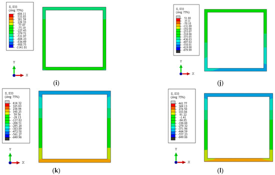 Longitudinal stress distribution of the stainless steel tube in the central cross-section when the ultimate bearing capacity is reached. (a) 120604C40-0-8. (b) 120604C40-1-8. (c) 120604C40-2.67-8. (d) 120604C40-0-48. (e) 120604C40-1-48. (f) 120604C40-2.67-48. (g) 1201206C40-0-4. (h) 1201206C40-1-4. (i) 1201206C40-1.33-4. (j) 1201206C40-0-48. (k) 1201206C40-1-48. (l) 1201206C40-1.33-48.