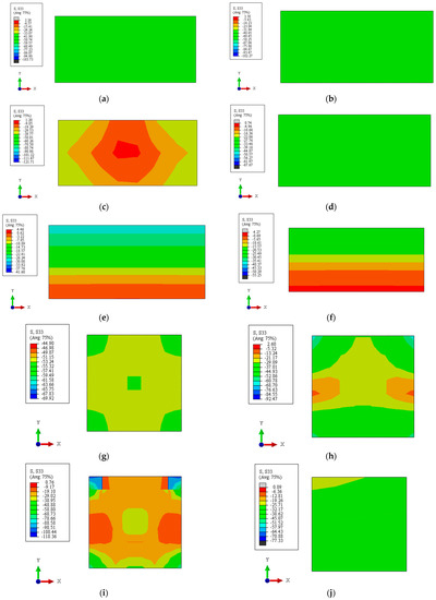 For rectangular specimens, we take specimen 120604C40 as an example. It can be seen from Figure 11a–c that when the specimen is under axial compression load and the slenderness ratio is eight, the longitudinal stress of the stainless steel tube has uniform distribution in the cross-section, and the longitudinal compressive stress exceeds the fy, which is the yield strength of the stainless steel tube, at up to 1.020 fy. When the specimen is under an eccentric compression load, the longitudinal stress of the stainless steel tube does not have a uniform distribution in the cross-section. When the relative eccentricity is one, the maximum longitudinal compressive stress and the minimum longitudinal compressive stress of the stainless steel tube are 0.961 fy and 0.430 fy, respectively. With the increase in relative eccentricity, the neutralization axis gradually moves upward along the y-axis, and the longitudinal stress in parts of the cross-section gradually changes from compressive stress to tensile stress. When the relative eccentricity is 2.67, the maximum longitudinal compressive stress and the maximum longitudinal tensile stress do not exceed fy, and the maximum longitudinal compressive stress and the maximum longitudinal tensile stress are 0.72 fy and 0.463 fy, respectively.