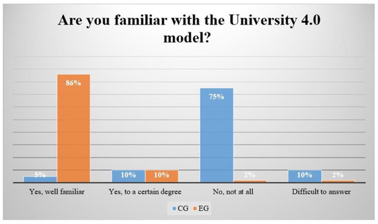 The answers to the question “Are you familiar with the University 4.0 model?” differed drastically across the two groups (Figure 2). Hence, CG students were more inclined to answer “No, not at all” (75%), 10% chose the option “Yes, to a certain degree,” the other 10%—“Difficult to answer,” and only 5% answered “Yes, well familiar.” The outcomes of surveying EG participants were significantly higher compared to those of CG. More precisely, they were distributed as follows: 86%—“Yes, well familiar,” 10%—“Yes, to a certain degree,” 2%—“No, not at all,” and 2%—“Difficult to answer.”