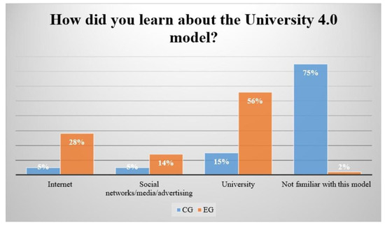Answers to the question “How did you learn about the University 4.0 model?” were tightly connected with the previous responses (Figure 3). In CG, they were distributed as follows: 5%—“Internet,” 5%—“Social networks/media/advertising,” 15%—“University,” and 75%—“Not familiar with this model.” The situation in EG was fully the same as with the replies to the first question—their indicators were higher than those of CG and were scattered in the following order: 56%—“University,” 28%—“Internet,” 14%—“Social networks/media/advertising,” 2%—“Not familiar with this model”.