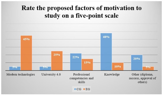 Figure 5 displays the answers to the question “Rate the proposed factors of motivation to study on a five-point scale: modern technologies, University 4.0, professional competencies and skills, knowledge, other (diploma, success, approval of others)”. As can be seen, the most positively assessed motivation factor among CG students was “Knowledge”—the highest score was given by 48% of them. “Professional competencies and skills” took the second place (22%). The third was the factor “Other (diploma, success, approval of others)”—20%, and then came “Modern technologies”—5%, and “University 4.0”—5%. What concerns the responses of EG students, they also differed significantly from CG’s answers. Thus, the option “Modern technologies” was rated by most students with the highest score (45%), followed by the “University 4.0”—25%, “Professional competencies and skills”—15%, “Knowledge”—10%, and “Other (diploma, success, approval of others)”—5%. Possible explanations for such results in the first group are the low level of students’ awareness of modern technologies and the model “University 4.0” and their proper use in the educational process. Instead, the students of the second group, who studied according to the program developed on the basis of modern technologies, were acquainted with the model “University 4.0”, which explains the high performance of these criteria.