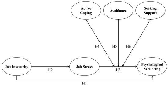 Additionally, people are exposed to various situations that induce emotions and respond in various ways according to emotional experiences. Because the appropriate response to emotional experience is directly related to personal adaptation and interpersonal success, people always feel the need for emotional regulation and ask how to deal with it [40]. In other words, job insecurity in hotel companies is not a property that hotel companies and organizational members can directly change, and this cannot leave the decline in psychological well-being caused by job insecurity as it is. However, as described above, if hotel workers’ job insecurity indirectly affects job stress rather than directly affecting well-being, it can be inferred that hotel employees are reducing their effect on well-being through emotional regulation strategies that can alleviate the relationship between job stress and well-being. Although there are differences in the number and name of emotional regulation modalities among researchers, they generally follow the distinction between an active coping method and avoidance. Furthermore, many researchers have suggested that efforts to seek social support and escape negative emotional states should be divided into separate modalities from the previous two modalities. Therefore, it can be concluded that emotional regulation strategies are divided into three categories: active coping, avoidance, and seeking support [45]. The following hypotheses were established to study which of these emotional control strategies can best alleviate job stress and increase the well-being of hotel employees due to job insecurity. In addition, the current study displays the hypothesized research model in Figure 1.