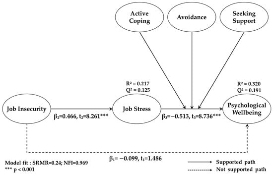 PLS-SEM examined the posited hypotheses. Specifically, a consistent PLS algorithm tested the parameters, and 5000 bootstrap samples, bias-corrected within a 95% confidence interval, were evaluated for statistical significance. Prior to hypothesis testing, the researcher confirmed the prerequisites for PLS-SEM. The results of the tests for Hypotheses 1, 2, and 3 using a PLS-SEM are shown in Figure 2. Standardized root mean square residual (SRMR = 0.24) and normal fit index (NFI = 0.969) demonstrate that the data fit the structural model well. Regarding the model’s explanatory power, 21.7% of the total variance of job stress is explained by job insecurity, while both job insecurity and stress account for 32.0% of the total variance of psychological well-being. Regarding the predictive relevance, both Q-squared (job stress = 0.125, psychological well-being = 0.191) values are greater than 0, which represents that both antecedents are appropriate in terms of the prediction relevance to the outcomes [54].