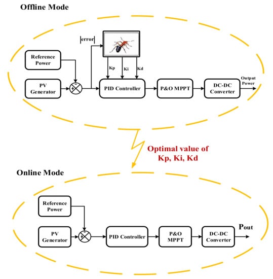 where is the error that is equal to . When these parameters are transferred into online mode the optimal PID controller tracks the MPPT. The online/offline working is depicted in Figure 3. The optimal value generated by the PID controller makes P&O a variable step size to enhance its efficiency by minimizing its oscillations, ripples, overshoot and response time.