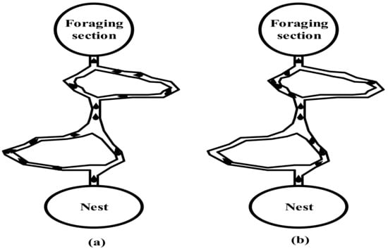 Foraging behavior: (a) Ants following double path; (b) Ants following the shortest path.
