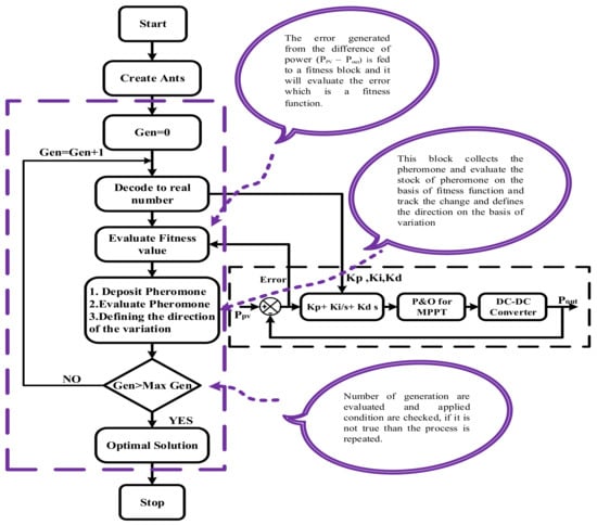 The complete work for tracking MPPT is depicted in Figure 5, where the ACO section is broadly demonstrated and its working is illustrated. The function of ACO is to optimize the PID controller on the basis of error, which is the difference in PV panel generated power and the output power of the converter (); this absolute error (fitness function) is fed to the ACO block for evaluation based on the concept of the foraging behavior of ants. The pheromones are evaluated and define the direction of the ants towards the strong and attractive place. Finally, the max fitness for each error will generate an optimal set of values of PID controller. These optimal values will create a variable step size in P&O that will ultimately generate an adaptive duty cycle for the DC-DC boost converter.