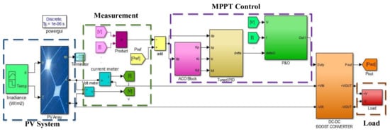 The proposed method is implemented on MATLAB/Simulation as shown in Figure 6., where different sections are highlighted and all of these sections contribute to developing a proposed ACO-based variable P&O.