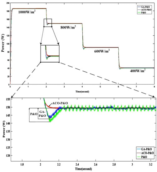 The obtained results from the proposed controller ACO-P&O are plotted in Figure 7, which show the high quality of tracking MPPT with minimum oscillations, response time, ripples and overshoot. The response is plotted under varying irradiance at a fixed temperature of .