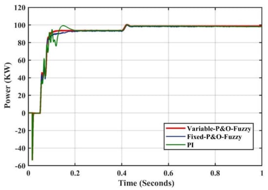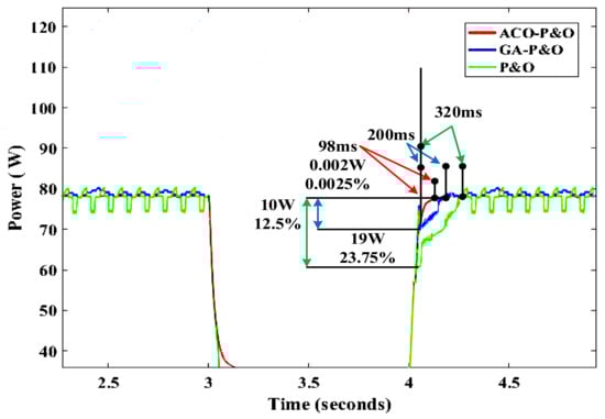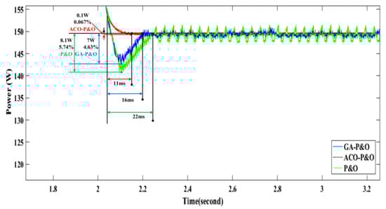 The proposed controller ACO-P&O is highlighted in red in Figure 8 where the response time of the proposed controller is and the loss in power is of the output power. The GA-P&O controller is shaded in blue with a response time of and the loss in energy is of the output power. The last compared result with the proposed controller is P&O with fixed step size that is plotted and the results obtained show a higher response time of where the loss in power is .