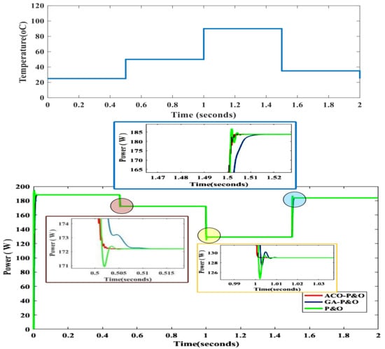 The ripple associated with ACO-P&O is minute in just settling the section while at rest; there is no ripple and it is around in tracking MPPT section. With other controllers GA-P&O has ripple in the equilibrium state around and P&O shows , which are high when compared to the proposed controller. Further analysis is carried out under varying temperature conditions which are set as random from and irradiance is kept fixed at . The proposed controller is also observed. The response under the varying temperature of ACO-P&O controller is analyzed in Figure 10.