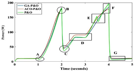 The result obtained from the applied test (ramp test) is shown in Figure 12. The result is highlighted in A, B, C, D, E, F and G to monitor the ACO-P&O algorithm with the GA-P&O and fixed step size P&O. The highlighted section clearly manifests the performance of the ACO-P&O algorithm, which shows high efficiency in tracking the MPPT while other controllers lack ability in tracking MPPT under changing irradiance conditions. Fixed step size P&O is depicting disorganized tracking due to confusing behavior under varying conditions; this scenario is highlighted in the E and F sections, where point D highlights the robust tracking of the proposed controller as compared to other controllers.