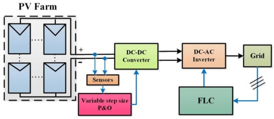 The PV network is extended to connect with a grid by the inverter. There are different stages involved: (1) converter and (2) inverter. The converter is controlled by the variable step size P&O approach, while the inverter is controlled by the fuzzy logic controller (FLC). Overall, the working model is showcased in Figure 13.
