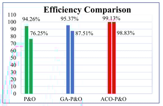 The crux of the research is presented in Figure 19, where the efficiency of the proposed controller is around whereas GA-P&O has efficiency around and P&O has the efficiency of around . The bar chart is designed for to change and the change in irradiance level clearly effects the efficiency of the algorithm although the proposed algorithm has shown robust tracking as compared to other algorithms.