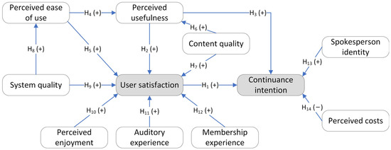 System quality (SQ) means the operation quality of the knowledge payment platform, including indexes, such as ease of use, flexibility, reliability, user-friendliness, and maintainability [63,64]. The system quality is characterized in the model by words such as version, system, tone quality, server, etc. This is one of the criteria that users use to measure the merits of knowledge payment platforms. The system quality obviously has a positive effect on the perceived ease of use [58]. In addition, the research of the information system success model (ISSM) [63] and Petter et al. [65] points out that system quality positively affects user satisfaction. Therefore, the following hypotheses are proposed: