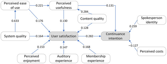 As shown in Table 4, there is a certain correlation between the internal lexical items of different topics. For example, the feature words, such as content, good book, work, and quality appear in topics, such as content quality, advertising content, resource experience, and lecturer quality. Feature words relating to the expense including payment, pageviews, and money do not merely exist in the topic of perceived costs. Content quality includes the content quality of knowledge payment products and contains lecturer quality, an abundance of resources, and loading of advertising content. Therefore, considering specific usage situations and the semantic correlation of comment texts of users, the topics including advertising content, resource experience, and lecturer quality are incorporated into the topic of content quality to refine factors affecting users’ continuance intention.