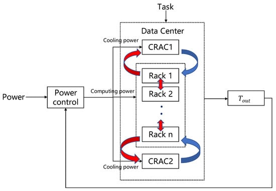 This section formulates an optimization problem for achieving an energy efficient and zero hotspot data center. Users send tasks to the data center through different types of applications, and as this phase is not the objective of this method of study, we directly translated the user demand ideally into the server utilization required to meet the user demand. The required computing power and the corresponding temperature variation were then calculated based on the user’s server requirements. To ensure the appropriate data center temperature, we carried out the power regulation for cooling according to the solution of the optimization problem presented in this section. Through the power control method in this paper, we controlled the optimal computing power and cooling power at each time slot, while achieving data center hotspot elimination and energy savings. The objective function that combines energy saving and hot spot elimination is as follows: